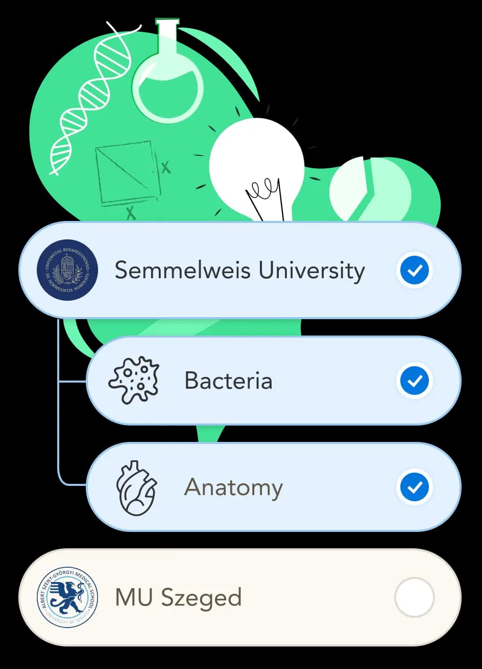You'll receive an all-in-one package with three courses: Biology, Chemistry, and English for Medicine. These are tailored to prepare you for the entrance exams at various Medical Universities in Hungary, including Medical University of Semmelweis, Albert Szent-Györgyi Medical School (Szeged), Medical University of Pécs, and Debrecen Medical School. These are suitable for various study programs such as medicine, dentistry, pharmacy, and more.